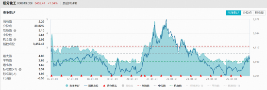 从估值方面来看,当前化工板块仍具配置性价比。数据显示,截至昨日(11月27日)收盘,化工ETF(516020)标的指数细分化工指数市净率为2.29倍,位于近10年来38.82%分位点的相对低位,中长期配置性价比凸显。