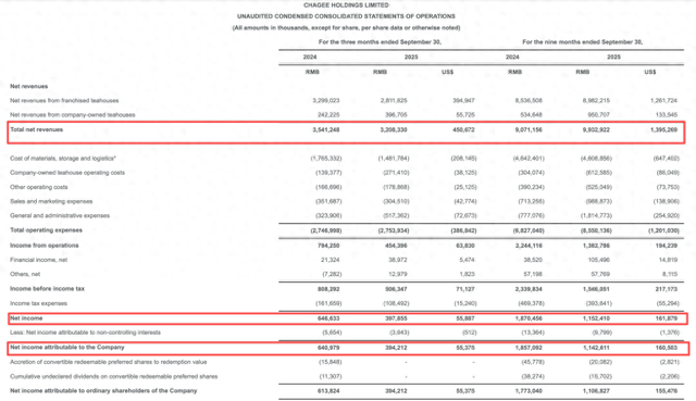 11月28日晚间,新茶饮品牌霸王茶姬(NASDAQ:CHA)公布了2025年第三季度财报。财报显示,第三季度净收入为32.08亿元,同比下滑9.4%;净利润为3.98亿元,同比下滑38.5%;归母净利润为3.94亿元,同比下滑35.8%;经调整后净利润5.03亿元,同比下滑22%;净利润率为12.4%,上年同期为18.3%。营业利润率为14.2%,上年同期为22.4%。
