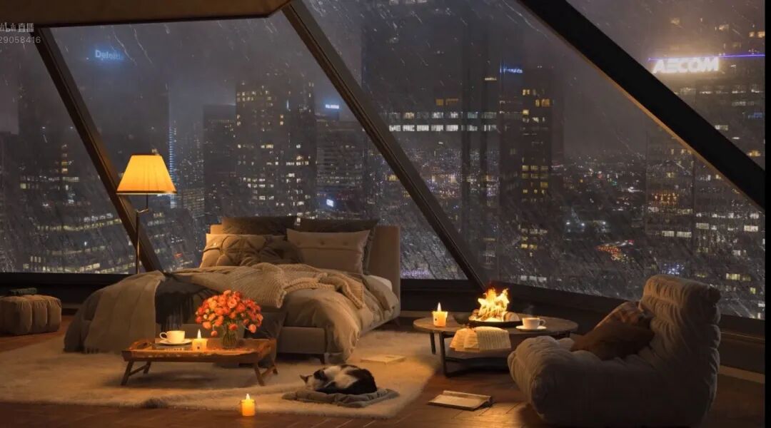 窗外是极端天气,看上去不适合出门。房间内点着一团噼啪作响的篝火,角落里还有充足的物资来捱过这个冬天……这里看起来像是世界末日场景下的庇护所,在每天晚上,你都能在抖音和B站的直播间内找到这些由AI生成的安全屋实景视频,它们正陪伴着很多人,度过一个又一个不眠之夜。