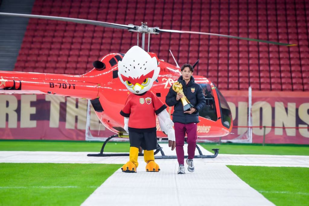 激动人心的夺冠视频过后,大家的目光被静候在内场的临港捷运纪念版直升机吸引,仪式开始前,这架直升机载着王燊超和奖杯从川沙飞抵球场。这一环节不仅是荣耀的展示,更是俱乐部积极探索“低空+足球”体旅融合新范式的生动实践。海港俱乐部与临港捷运本赛季已联合推出多次低空游览活动,通过拓展城市空域观赛新场景,延伸球迷体验的维度。未来,双方还将继续推进更多融合项目,共同助力上海低空经济生态的创新。