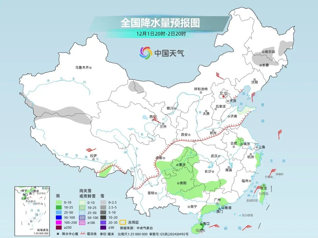 明后天,华南地区低空有南风输送水汽,会导致小范围降雨。此外,12月2日,南方降雨将短暂发展增多,出现成片小雨,近期干燥的天气将会有所缓和。