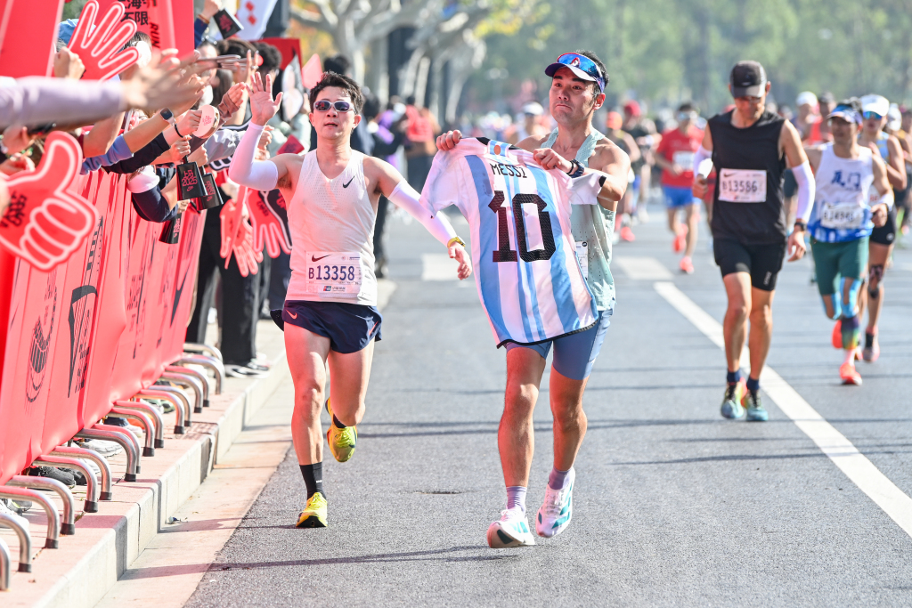 在今年的终点休息区,沪语电影《菜肉馄饨》搭建的展台带来了一批主创人员,也吸引了众多外国跑者驻足。演员周野芒一遍遍耐心教授外国跑者上海话,以本土语言文化传递真挚的加油情感,展现上海独特的城市魅力,同时也助力沪语文化的传承与推广。